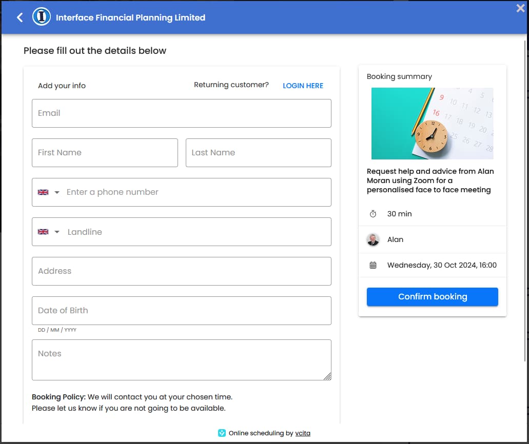 If you are an existing client or you have registered before the system will remember your details and you can view a record of your previous meetings.