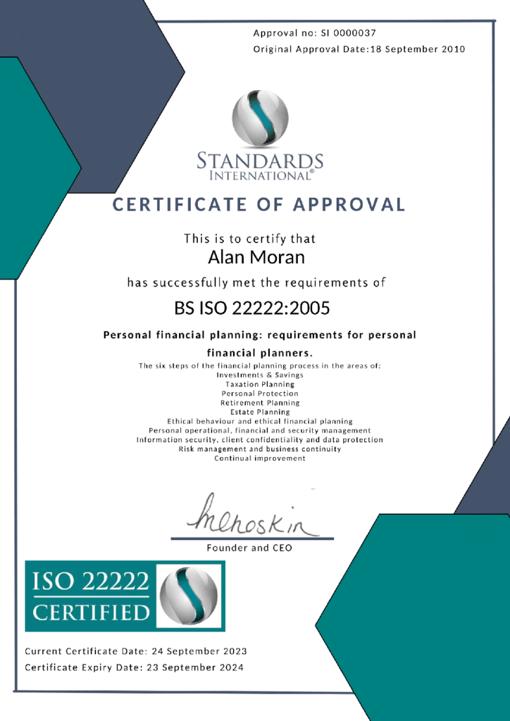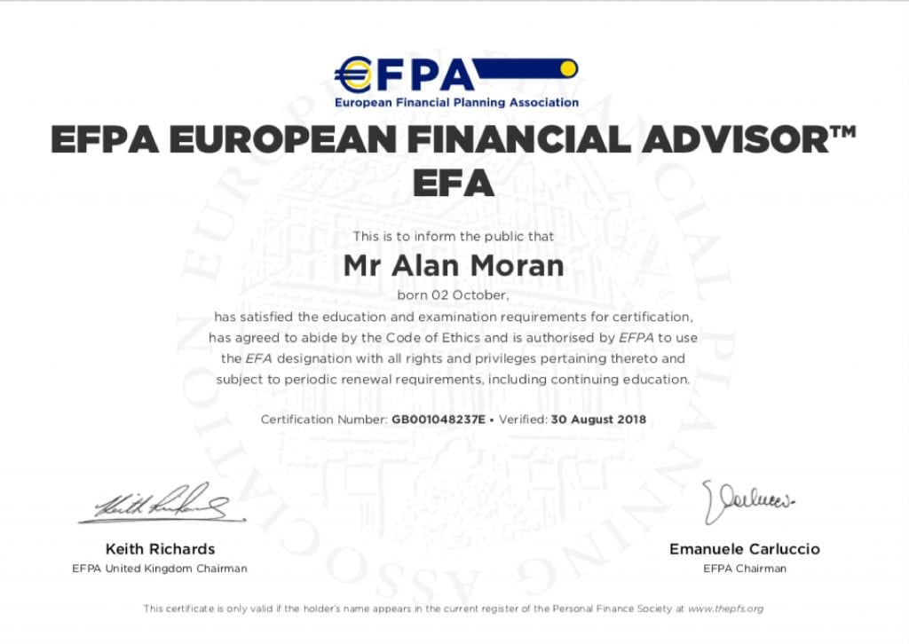Alan Moran has acted on our behalf for over 10 years. Alan has over this time always listened to our requirements and fed back to us the best options, given our constraints and made very useful alternatives suggestions. He has always been friendly and considerate. I would not now consider making any financial investment or savings decision without first consulting him.