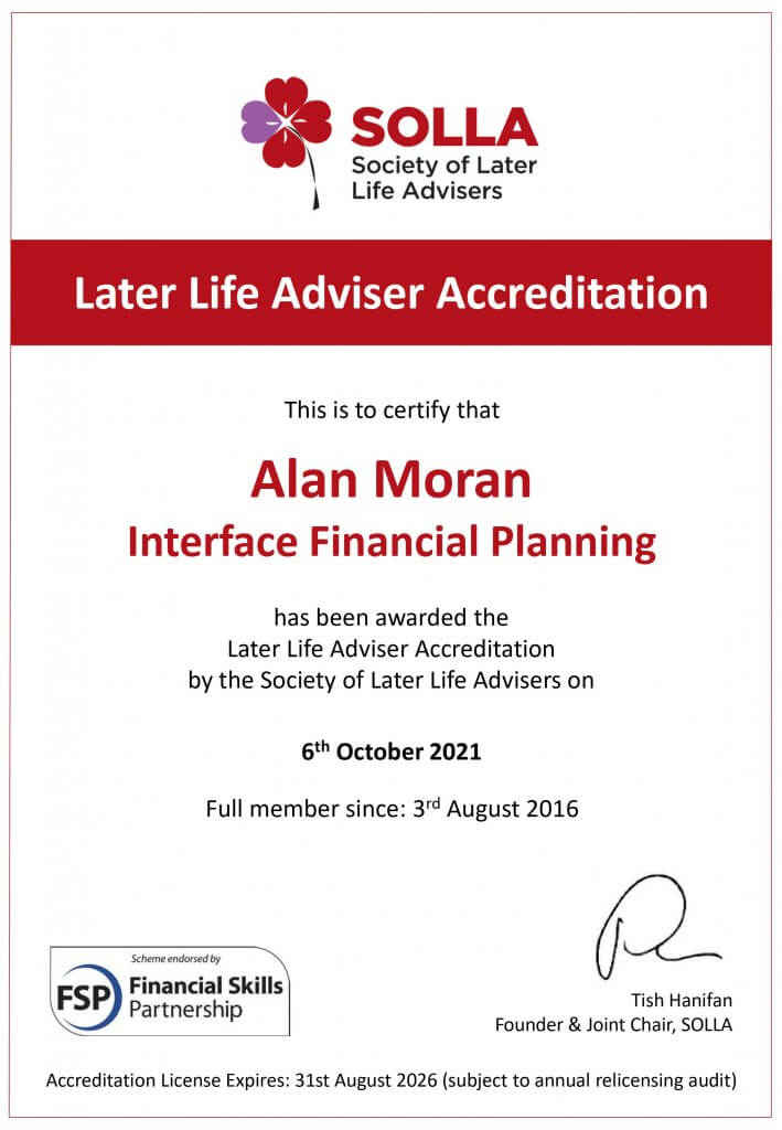 We have been clients of Alan Moran (Interface Financial Planning Ltd) for over five years. In this time, his highly professional, friendly and supportive approach has provided us with a thorough review of all aspects of our finances. We are now in a position where both our short term and long term financial planning is well organised and structured to suit our personal needs. We have recommended Alan and his team to many of our friends and know that they, like us, have been impressed and grateful for the care he has taken to provide such individual service.